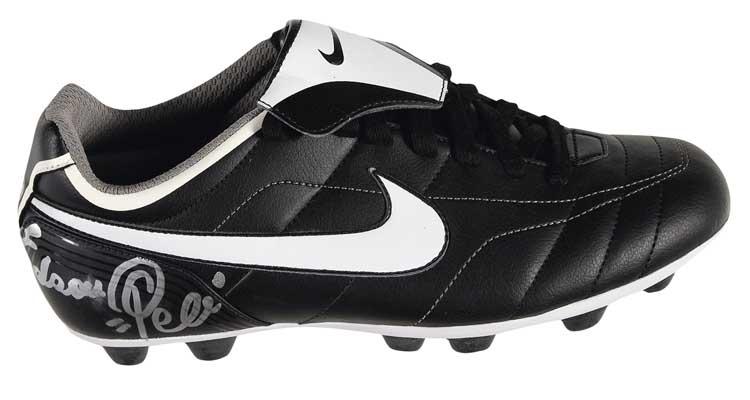 Black Nike soccer cleat, size 9.5, signed on the heel in silver ink, “Edson Pelé.” In fine condition, with a light brush to signature. Pre-certified Steve Grad/PSA/DNA and RRAuction COA.