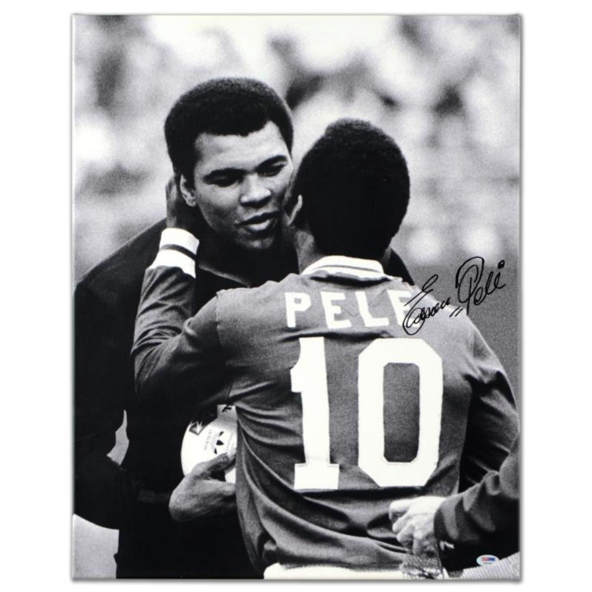 "Pele & Ali Hug" is a gallery wrapped print on canvas that is autographed by legendary Brazilian footballer, Pele! This piece was authenticated by PSA/DNA, which authenticates sports memorabilia using proprietary permanent invisible ink as well as a strand of synthetic DNA. Comes with PSA/DNA sticker bearing the registration number (#AB55449). We make no additional warranties. Measures approx. 20" x 25" (image). Reference #: 218811.