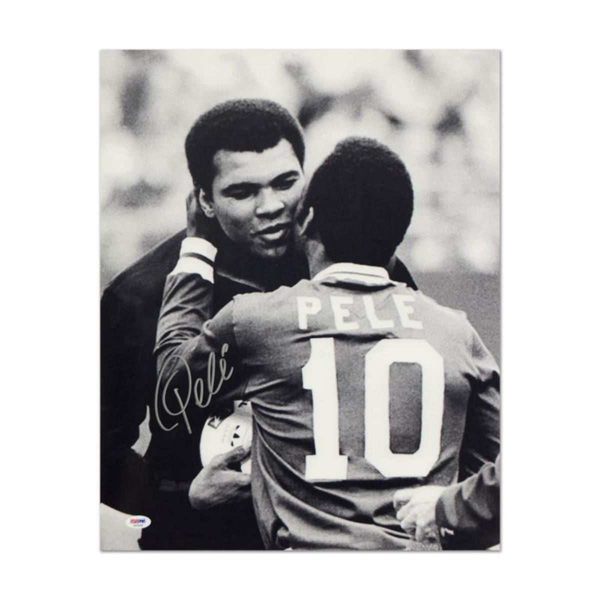 "Pele & Ali Hug" is a print on paper that is autographed by legendary Brazilian footballer, Pele. This piece is presented with a Certificate of Authenticity from PSA/DNA, which authenticates sports memorabilia using proprietary permanent invisible ink as well as a strand of synthetic DNA. We make no additional warranties. Measures approx. 16" x 20" (image). Reference #: 224254.