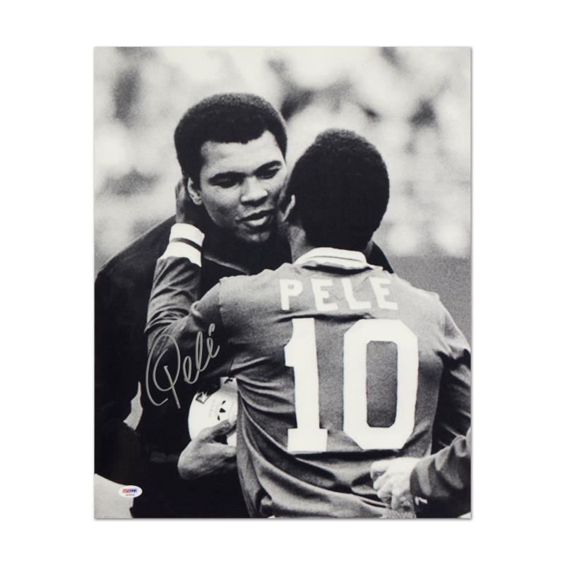 "Pele & Ali Hug" is a print on paper that is autographed by legendary Brazilian footballer, Pele. This piece is presented with a Certificate of Authenticity from PSA/DNA, which authenticates sports memorabilia using proprietary permanent invisible ink as well as a strand of synthetic DNA. We make no additional warranties. Measures approx. 16" x 20" (image).