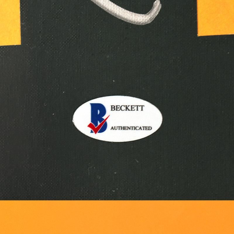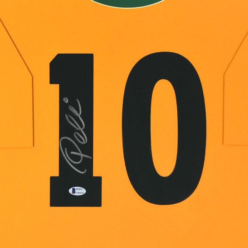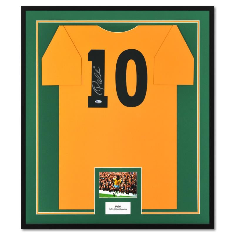 This is a paper cut display of a Pele jersey, hand signed by the legendary soccer player. This piece bears an official Beckett Authentication Services serially numbered hologram for authentication. This piece comes framed. Measures approx. 30" x 34" (frame), 23" x 28" (cut out). Please note: this cut display resembles a jersey; however, this is not a jersey.