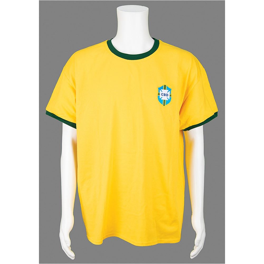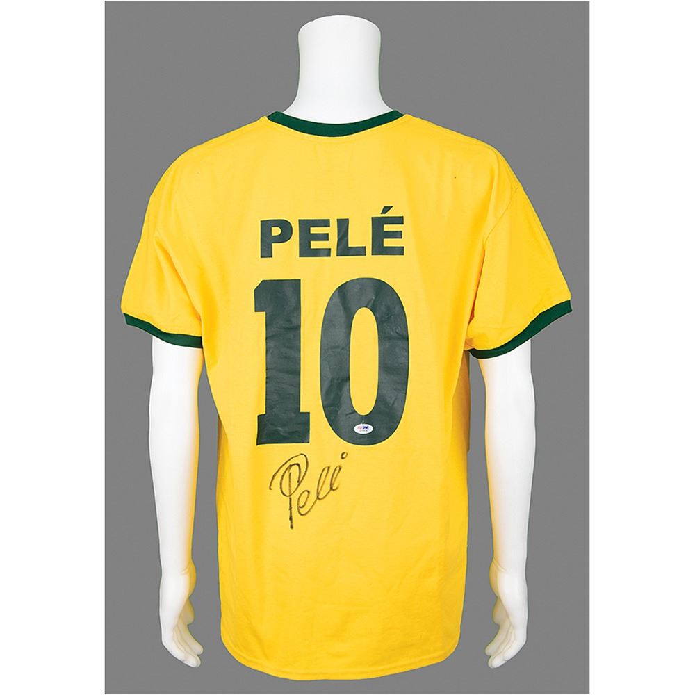 Copa Mundo replica CBD Brazil Pele soccer jersey, size XL, prominently signed on the reverse in black felt tip by Pele. In very fine condition, with a PSA/DNA label affixed to the number. Accompanied by a certificate of authenticity from PSA/DNA.
