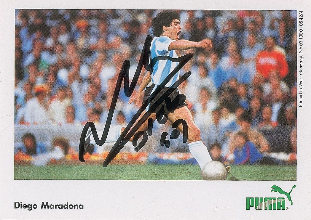 Two color Unicor and Puma promotional photo cards, 4 x 6 and 5.75 x 4, individually signed in black felt tip by soccer legends Pele and Diego Maradona. In overall fine condition.