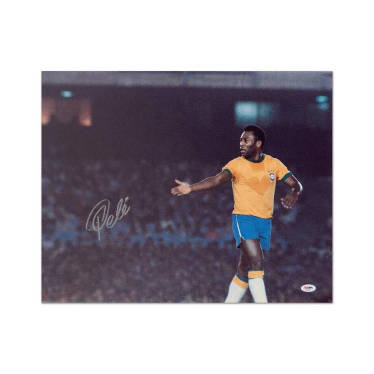 "Pele" is a print on paper that is autographed by legendary Brazilian footballer, Pele. This piece is presented with a Certificate of Authenticity from PSA/DNA, which authenticates sports memorabilia using proprietary permanent invisible ink as well as a strand of synthetic DNA. We make no additional warranties. Measures approx. 20" x 16" (image).