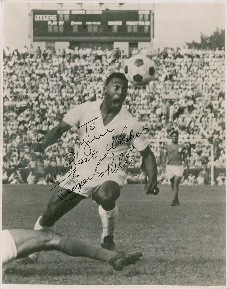 Vintage 7.5 x 9.5 photo of a young Pele in action on the pitch, signed and inscribed in black ink “To Jim, Best wishes, Edson Pele.” In very good condition, with creases to image and background, some light marks to finish, and news clipping remnants on reverse.