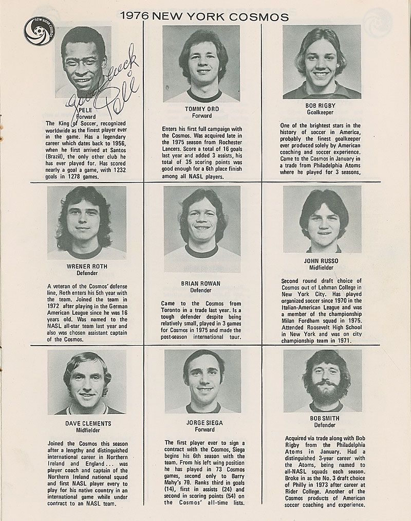 Program for a New York Cosmos vs. Dallas Tornado soccer game at Pontiac Stadium on September 6, 1976, 8.5 x 11, signed inside near his image in black ballpoint, “Good luck, Pele.” In fine condition. Accompanied by a full letter of authenticity from JSA.