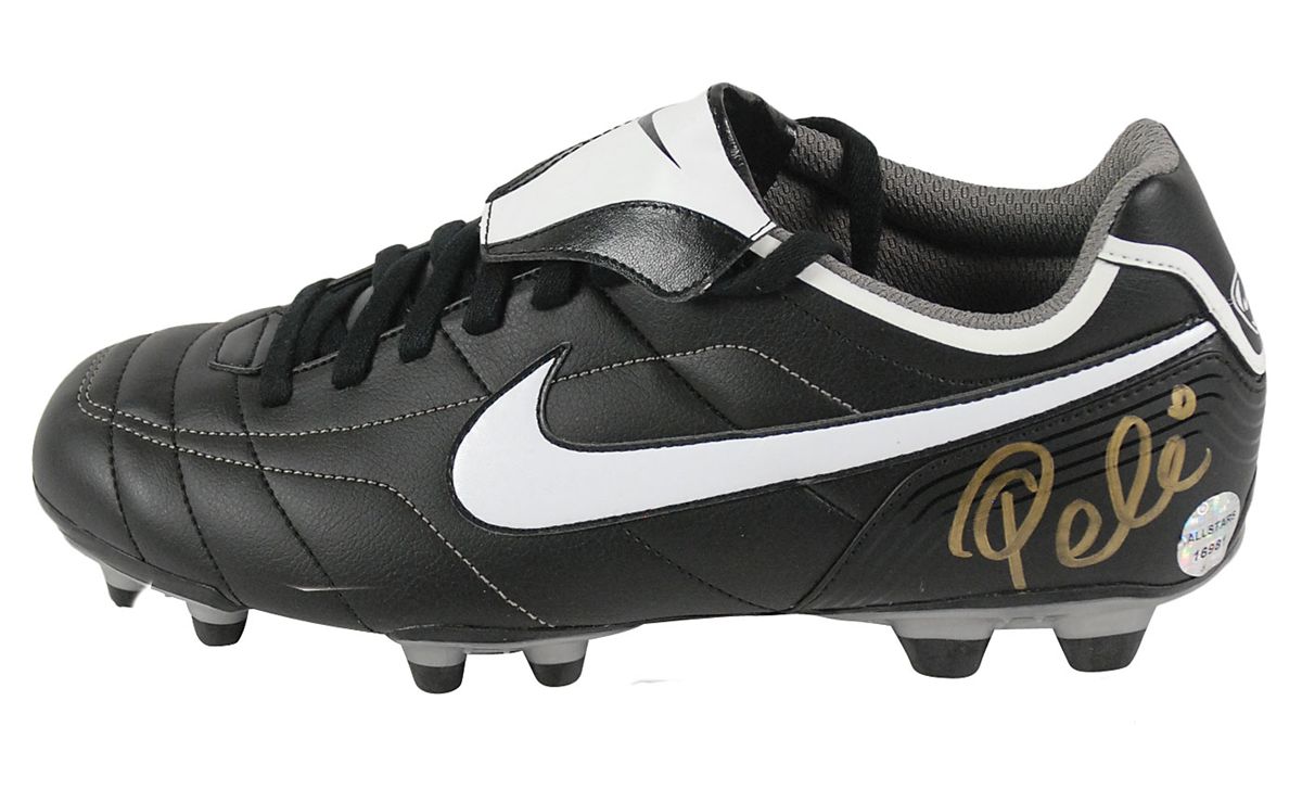 Black and white left-footed Nike soccer cleat, size 11, signed near the heel in gold ink. In fine condition.