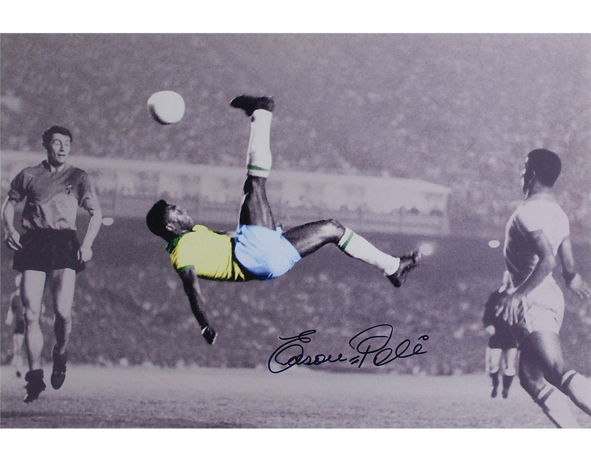 Color-tinted satin-finish 29.5 x 20 photo of Pele performing a bicycle kick, signed in black felt tip. In fine condition, with a few scattered creases.