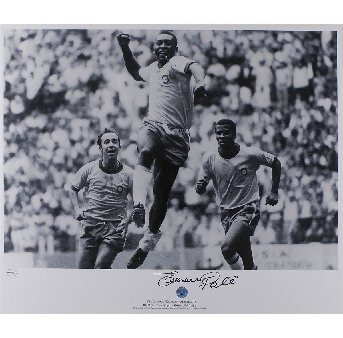 Glossy 23.75 x 20 photo of Pele celebrating at the 1970 World Cup final, signed in the lower border in black felt tip, “Edson Pele.” Rolled and in fine condition.