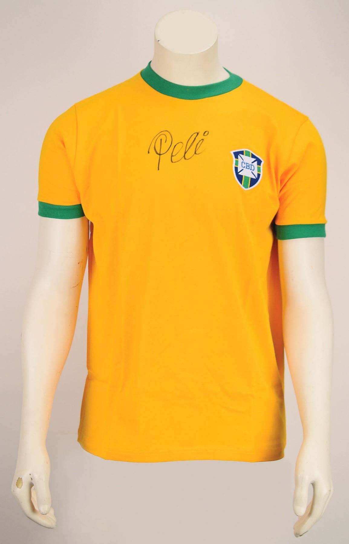 Attractive yellow-and-green Athleta soccer jersey with embroidered CBD (Confederação Brasileira de Desportos) emblem patch to left chest and sewn-on "10" on back, prominently signed on the chest in black felt tip, "Pele." In very fine condition. Accompanied by a certificate of authenticity from PSA/DNA.