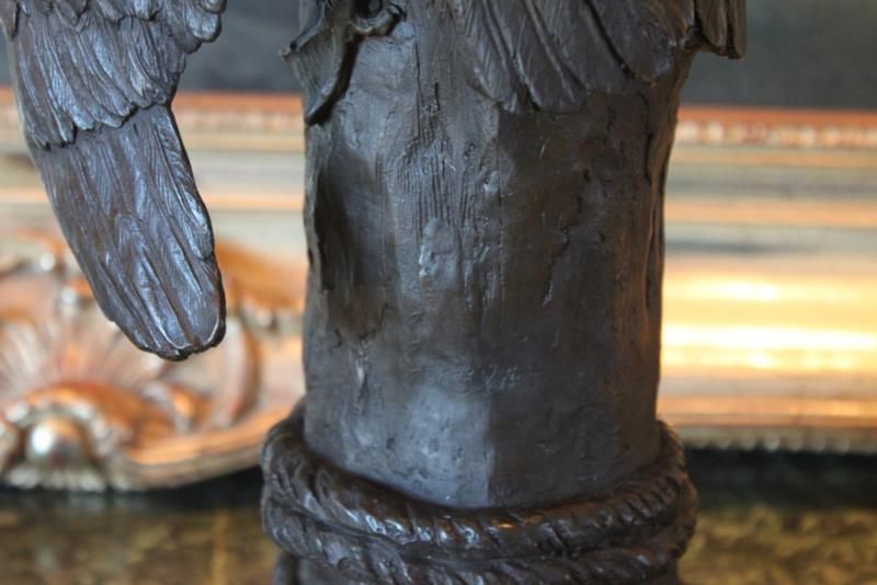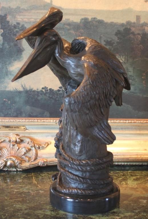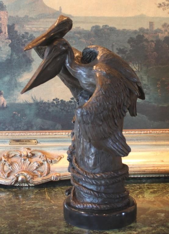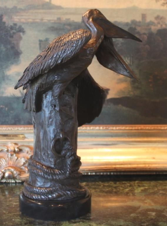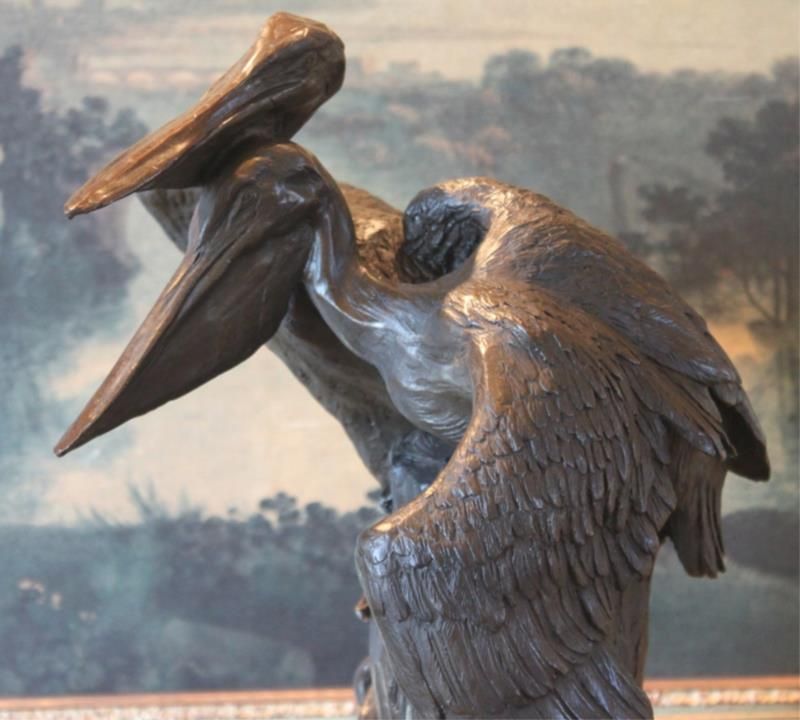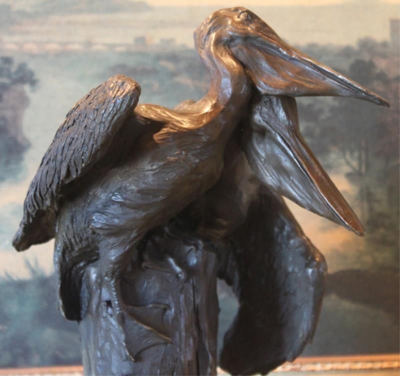 Pelicans Bronze Sculpture, 15 H x 8L x 8D 20lbs. This bronze sculpture was produced using the "Lost Wax" casting method. The "Lost Wax" Cast method is the most precise metal casting technique in existence, ensuring exquisite detail of the original host model which is usually sculpted in clay or wax. This "Lost Wax" casting method is an extremely labor intensive and expensive process, but the end results produce a Heirloom Quality Masterpiece!