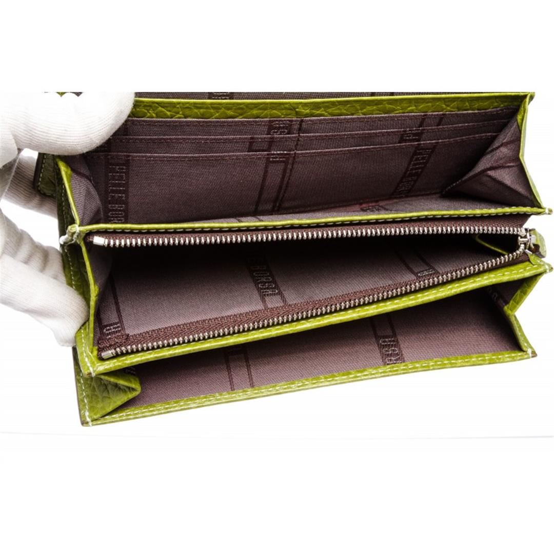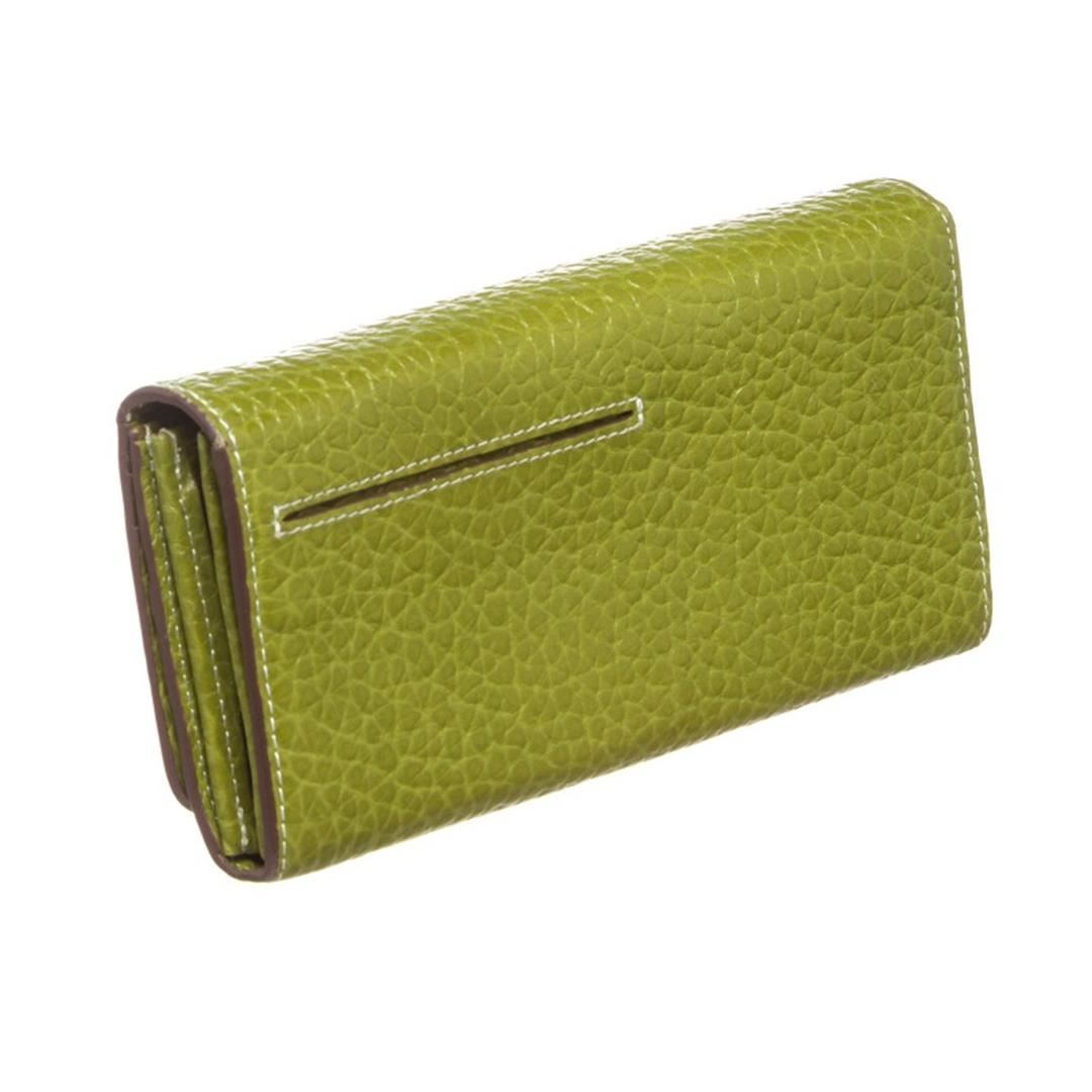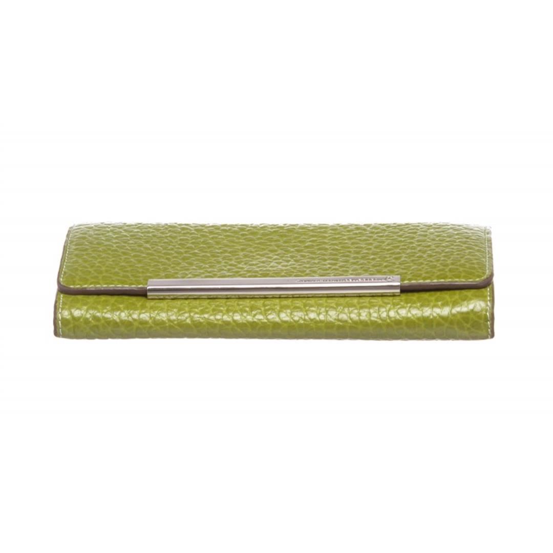 Crafted out of green pebbled leather, silver tone hardware, and flap snap closure. Inner eight card slot, brown fabric lining, bill slip pockets, and zip closure coin pocket. Item is pre-owned. Item Dimensions: 7.5"x1.25"x3.5"/19.05cmx3.17cmx8.89cm.