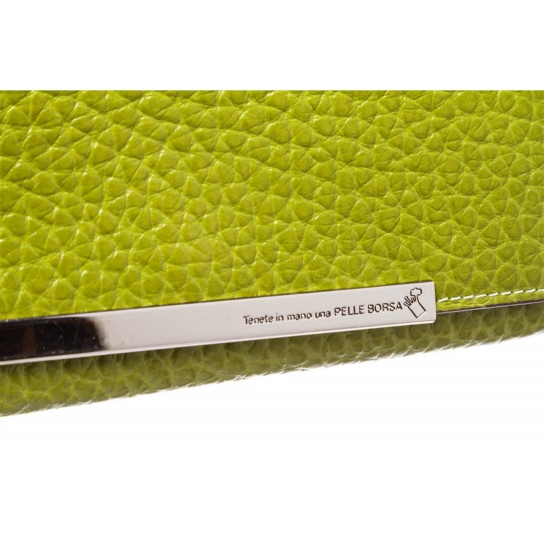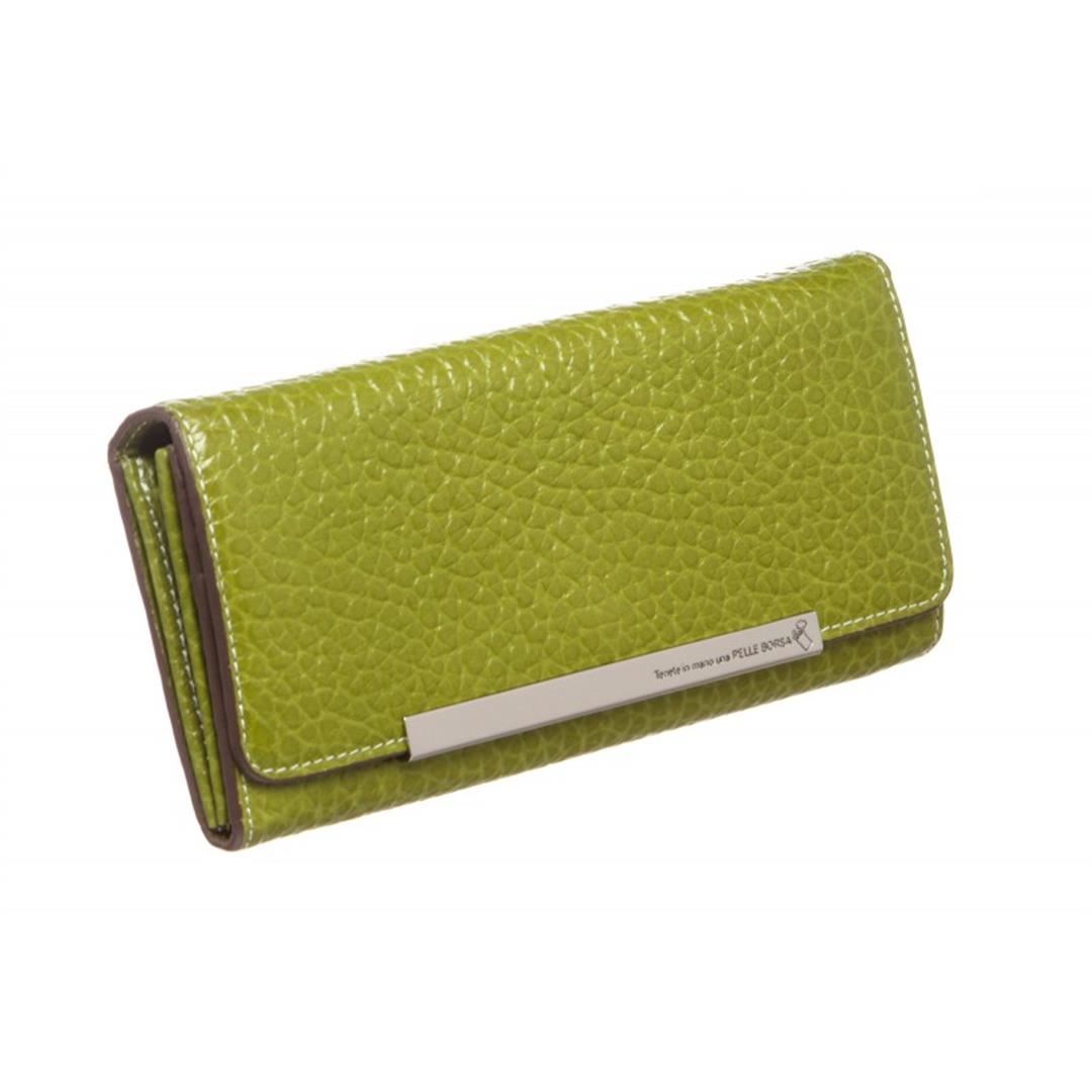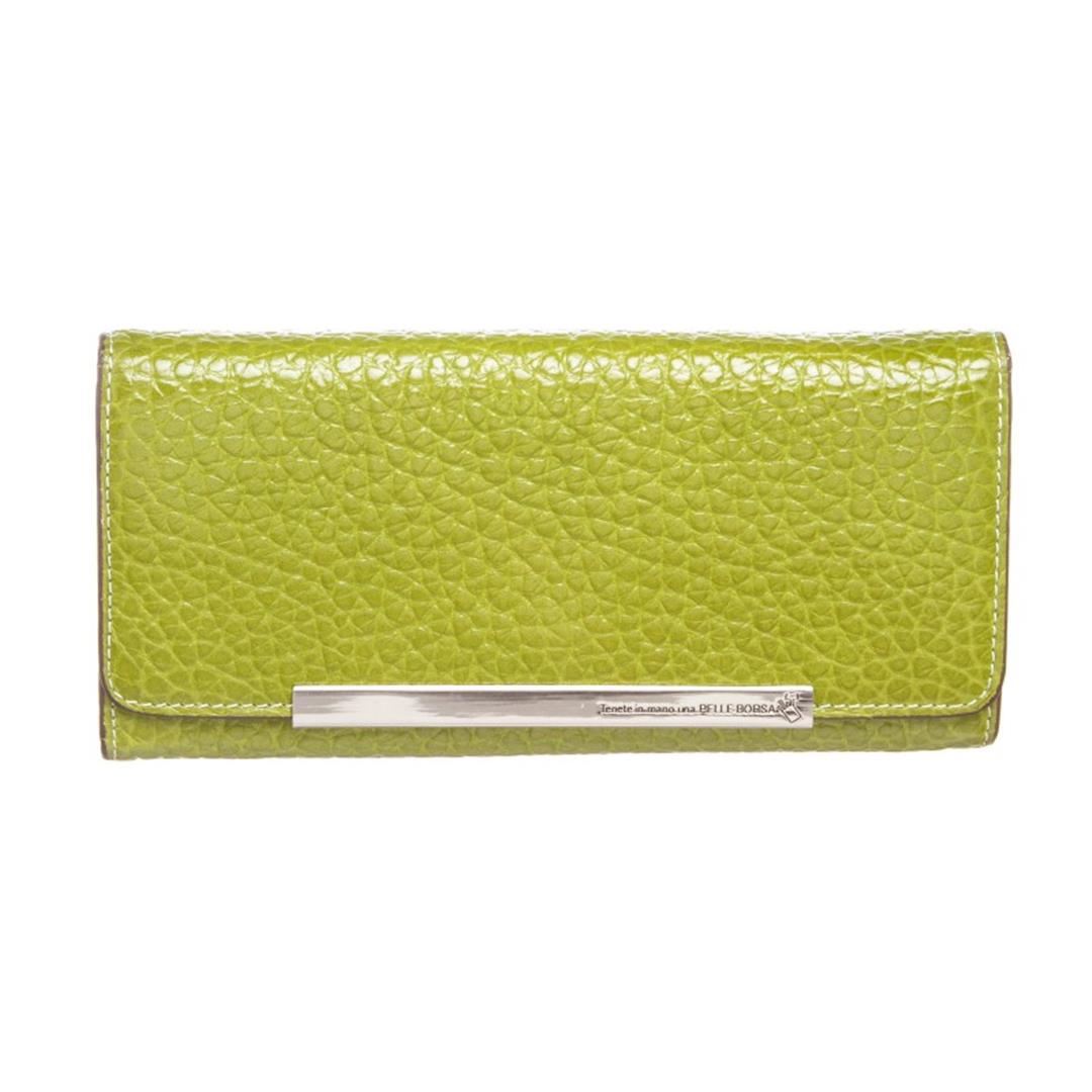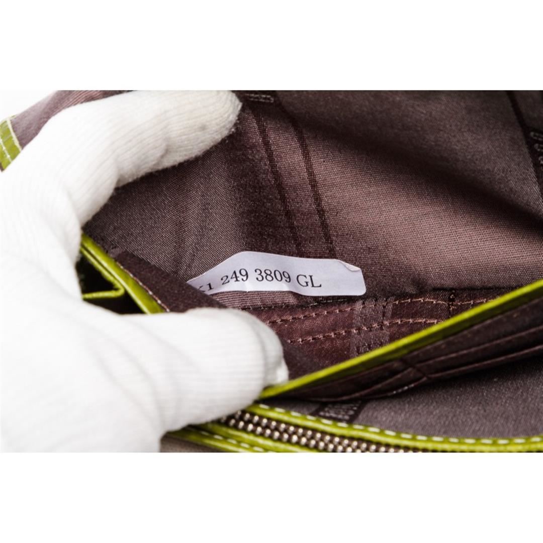 Crafted out of green pebbled leather, silver tone hardware, and flap snap closure. Inner eight card slot, brown fabric lining, bill slip pockets, and zip closure coin pocket. Item is pre-owned. Item Dimensions: 7.5"x1.25"x3.5"/19.05cmx3.17cmx8.89cm.