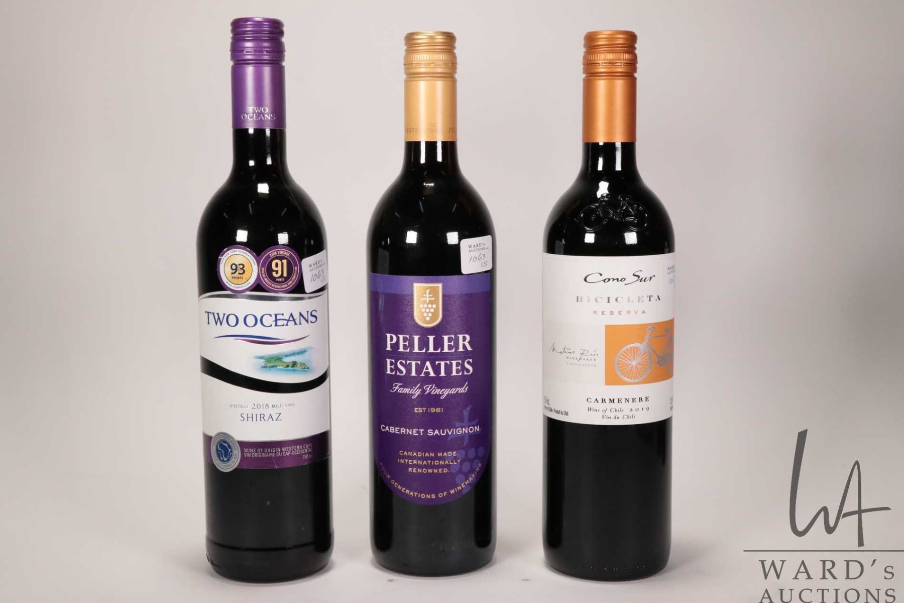 Pellier Estate/ Cabernet Sauvignon/ 750ml/ 12.5% ABV, Two Oceans/ 2018/ Shiraz/ 750ml/ 13.5% ABV and Cono Sur/ Bicicleta/ 20019/ Chilean Red wine/ 750ml/ 13.5% ABV Note: Alcohol cannot be insured by any courier in Canada. Local pick up is recommended. Canadian bidders only.