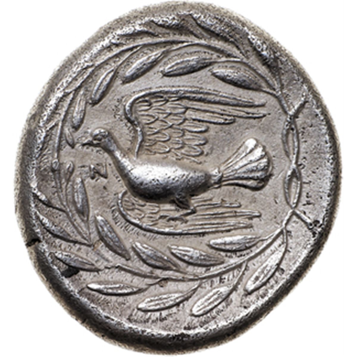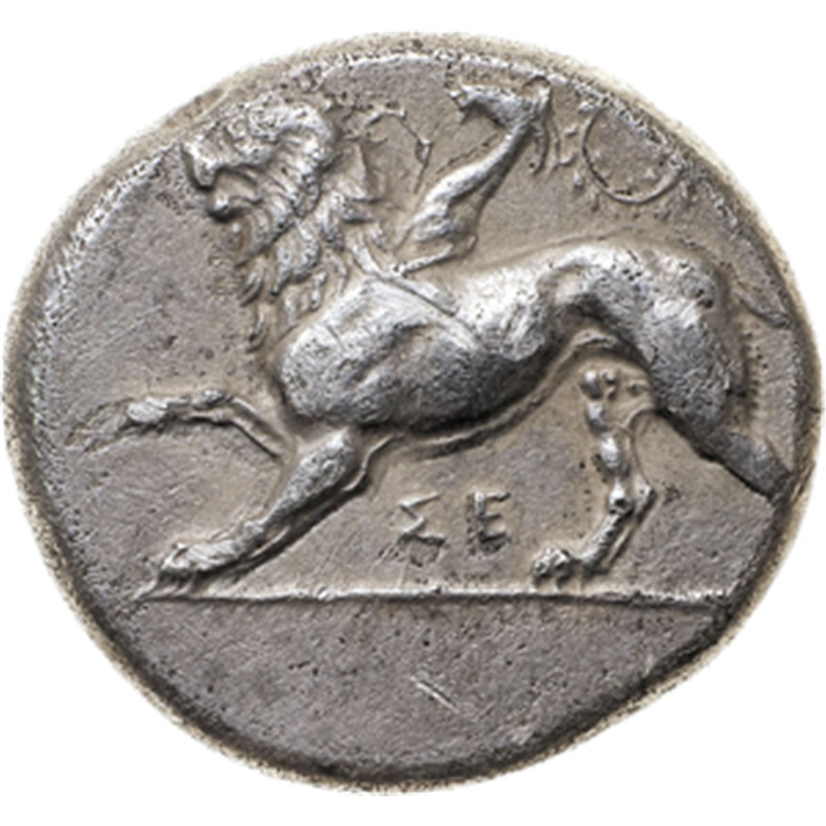 Mondo Greco. Grecia Continentale. Peloponneso, Sikyon. Statere, ca. 330 a.C. D/ Chimera a sinistra. Sopra, corona. Sotto, ΣΕ. R/ Colomba che vola a sinistra. Sotto la testa, N. Tutto entro corona d'olivo annodata a destra. BMC 57. BCD Peloponneso 219. AG. g. 11.89 mm. 24.00 qSPL.