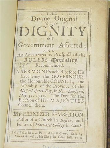 Pemberton, Ebenezer. The Divine Original and Dignity of Government Asserted; and an Advantageous Prospect of the Rulers Mortality Recommended. A Sermon Preached Before His Excellency the Governour, the Honourable Council, and Assembly of the Province of the Massachusetts-Bay. Boston: Printed By B. Green. Sold By Samuel Gerrish, 1710. 16mo - over 5¾" - 6¾" tall. Hard Cover. Ex-Library. Very Good condition. The title continues - In New England, May 31, 1710. The Day for the Election of Her Majesties Council There. 106pp bound in 1/2 red leather and marbled paper, bright gilt lettering on spine. Occasional foxing. BINDING AND HINGES TIGHT. AN ELECTION SERMON.