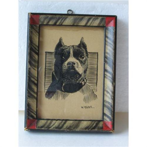 The portrait of a person's beloved pet done in pen and ink and signed by "W.M.Mitchell", on lower right, a recognized Canadian artist.The pen and ink drawing is in a carved and painted frame made by the artist .As the portrait is unique so is the frame as the frames made by Mitchell were an integral part of his works,and this one is particularly appealing.See the inscription on the reverse pertaining to the commision of the work (see image).Further information on the artist can be obtained in " A Dictionary of Canadian Artists" by Colin S.MacDonald.Dimensions framed :4.25 X3.25 inches.Thank you