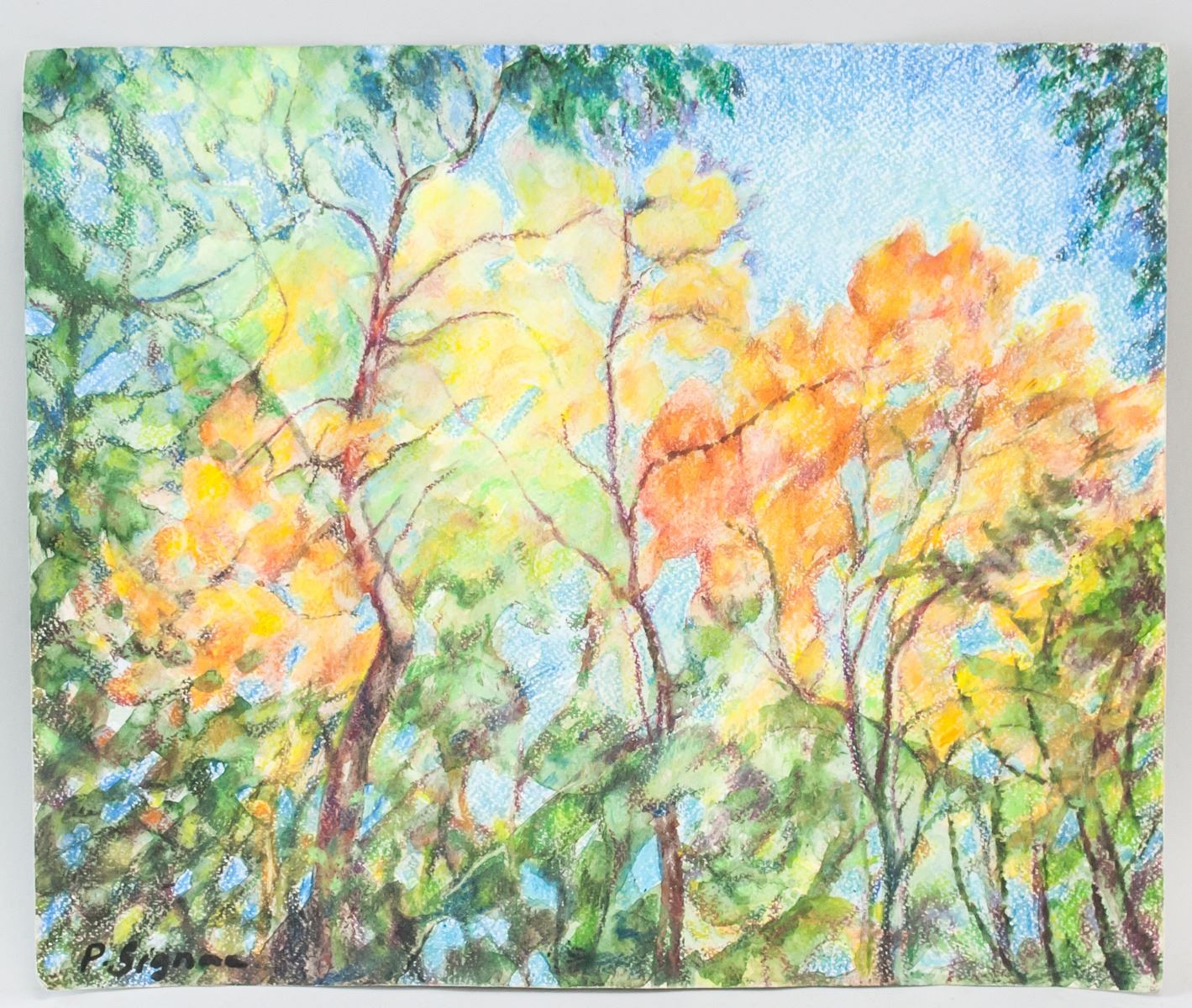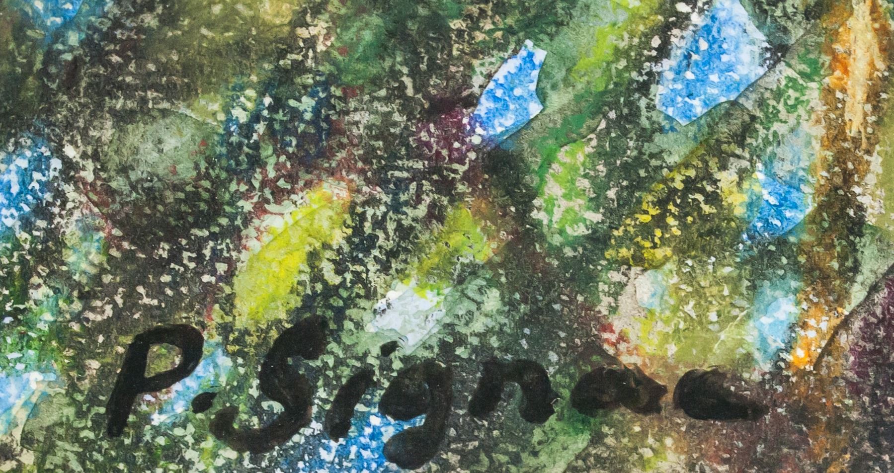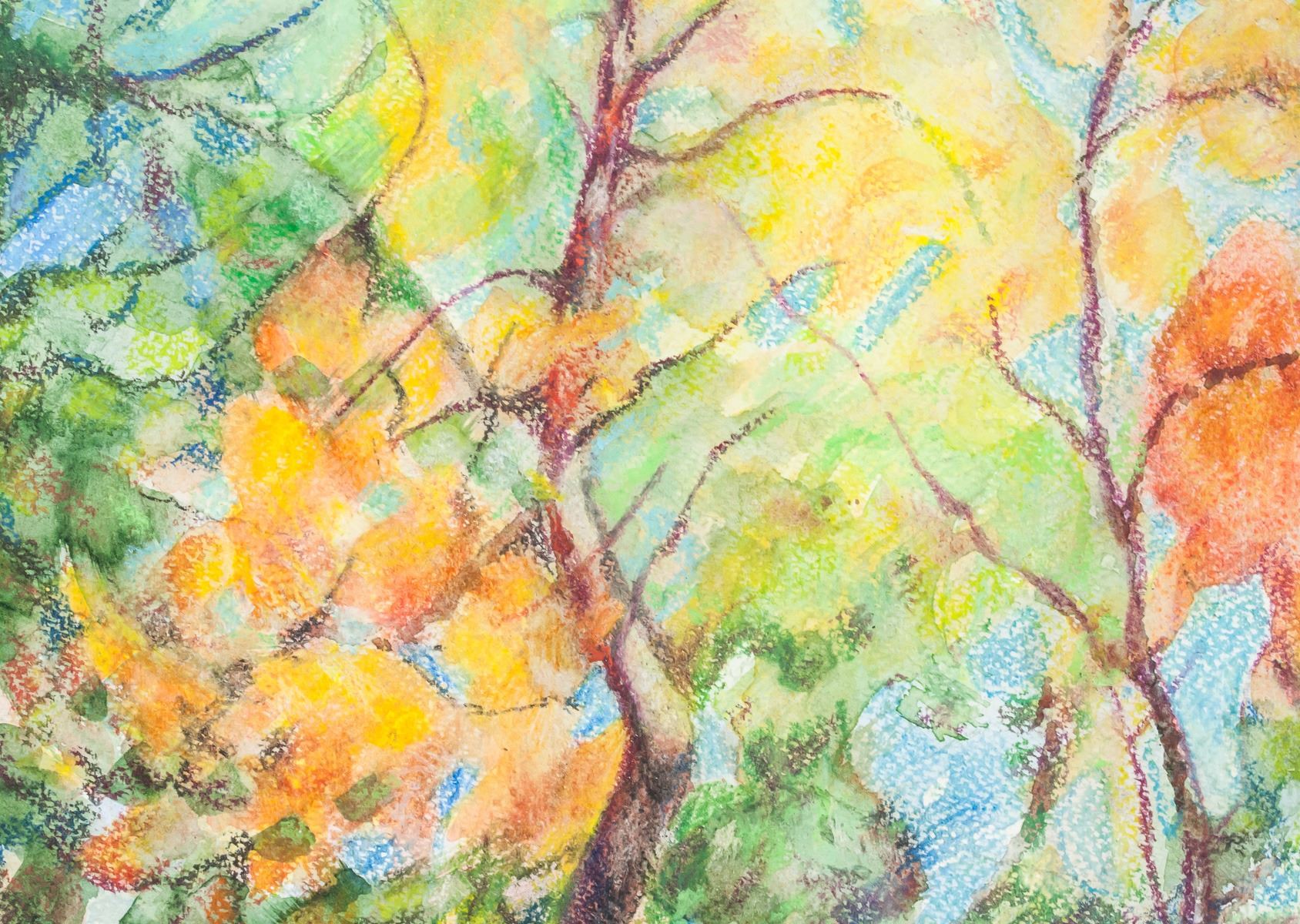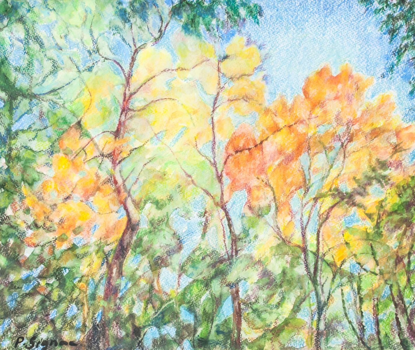 Pencil and watercolor on paper. Featuring autumnal trees and vibrant blue sky. Signed "P. Signac" in the bottom left corner. 29 x 36 cm (11.5 x 14 inch).
