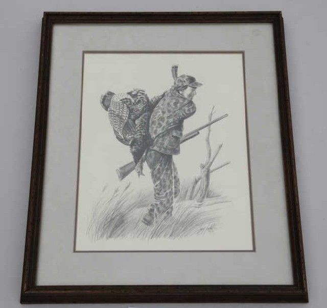 Pencil drawing of happy hunter with turkey on back signed lower right Larry Toschik 1980 probably for a magazine illustration. Approx. 14-3/4”x11” slight coloration, near mint. From the Estate of Robert E. Petersen. Est.;$150-$300