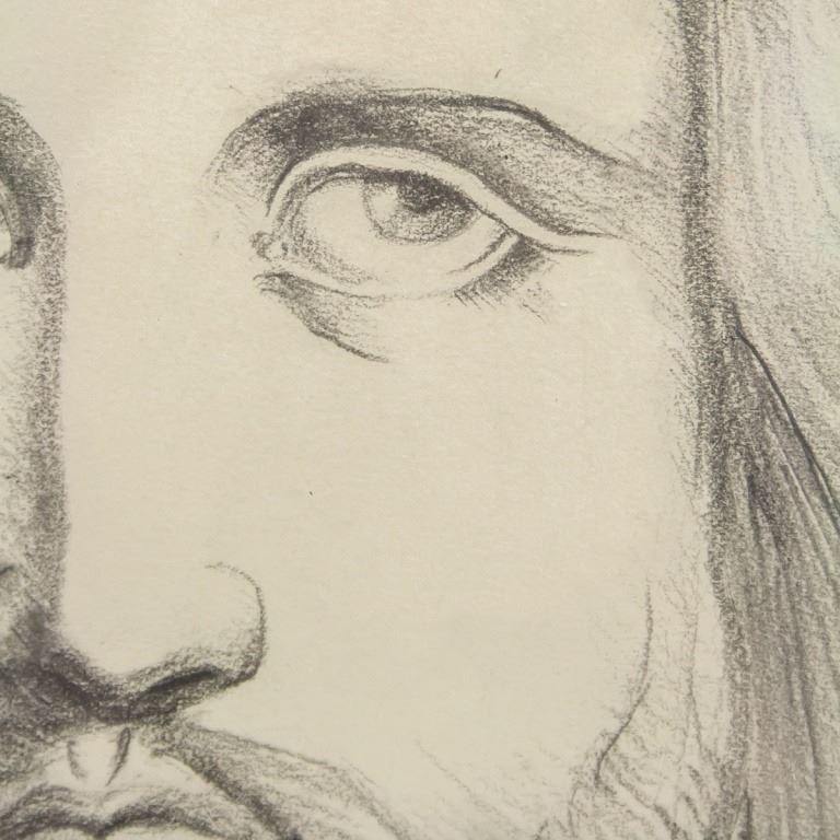 Pencil on paper, framed. Featuring portrait of a bearded man resembling Jesus. Paper size: 28 x 22 cm (11 x 8.7 inches). Frame size: 23 x 17 cm (9 x 6.7 inches).