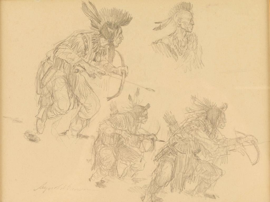 depicting Indians with bows and arrows, signed lower left. Image measures 7"x9" in double mat with silver wood frame. Personal note from artist written on back of picture. Reynold Brown was born in 1917 in Los Angeles as William Reynold Brown to William Reynold Brown (a railroad engineer) and his wife Ada (Fairley) Brown. He drew continuously as a child. He particularly liked telling stories by drawing, He got a well rounded art education in Alhambra High School in California under the stewardship of a World War I veteran and artist, Lester Bonar.About 1937, with the help of Bonar, he was able to get a job inking and then drawing the syndicated comic strip by Hal Forrest, "Tailspin Tommy." This strip told the story of a barnstorming pilot, Tailspin Tommy. Brown worked on the strip until 1941. Through Bonar, Brown was able to meet Norman Rockwell. Rockwell advised Brown that if he wanted to learn illustration he would have to leave the comic strip and start finding jobs as an illustrator. With the outbreak of World War II, Brown was able to use his aircraft rendering skills learned from working on Tailspin Tommy to land a job with North American Aviation in California. On some of these he collaborated with another artist, Mary Louise Tejeda, the only woman artist in the department of over forty men. In 1946, at war's end, Brown married Tejeda. They moved to New York so he could pursue a career in illustration. His illustrations appeared in magazines such as Boys' Life, Outdoor Life, Popular Science and Argosy. n 1951, while doing a show for Art Center, Brown met Misha Kallis, an Art Director for Universal Pictures. Brown soon completed his first movie poster for Universal, The World in His Arms, featuring Gregory Peck and Ann Blyth. That began a series of over 250 campaigns for Universal, MGM, Disney and American International Pictures (AIP). Brown's work was used to promote classics like Ben Hur and Spartacus, westerns such as The Alamo and Taza, Son of Cochise and drama, horror, monster and science fiction films. His science fiction works for such pieces as The Time Machine and This Island Earth, as well as his monsters like The Creature from the Black Lagoon have already become popular among collectors.