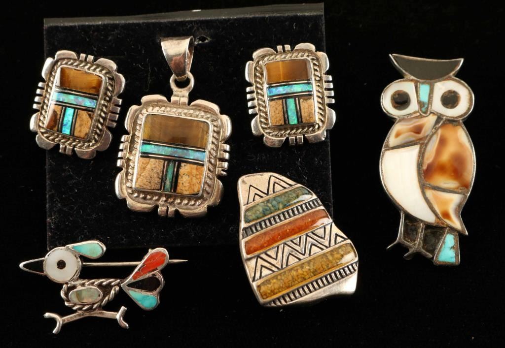 (1) Nice Pendant and pierced earrings matching set with opal and tigers eye stamped "Sterling" on all pieces pendant measures 1" X 3/4" and earrings measure 5/8" X 1/2" (1) 1 3/8" Silver owl pin with a variety of stones (1) silver roadrunner pin with a variety of stones measures 1" (1) silver pendant/pin with designed and crushed stones marked "R" & "925"