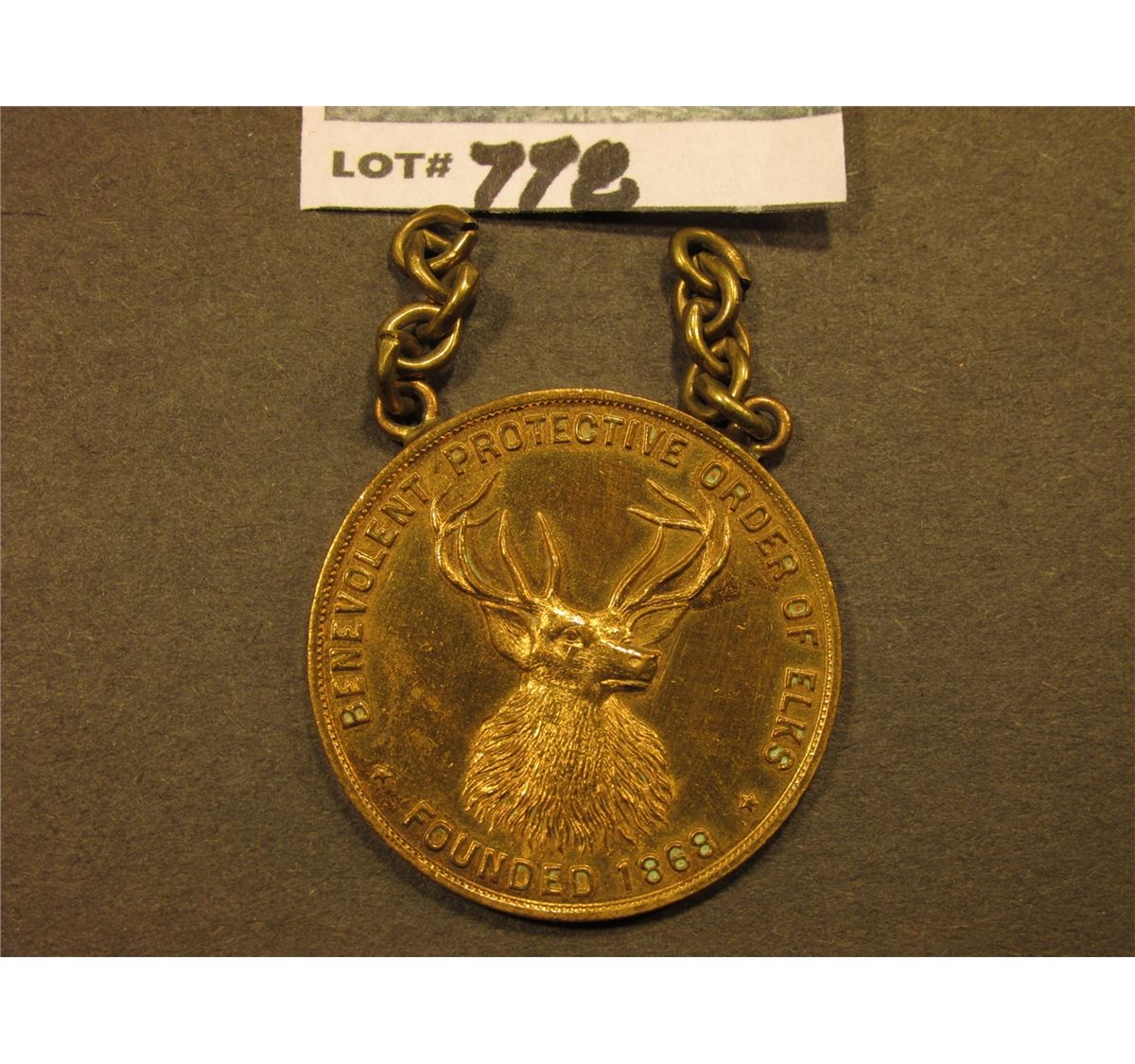 Pendant Medal with two small links of chain attached "Benevolent Protective Order of Elks/Founded 1868", plain reverse. Elk depicted on obverse.