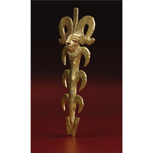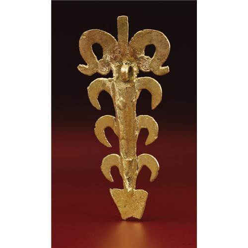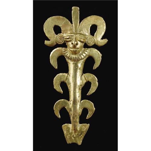 <B>Pendant Probably Representing a Shaman</B></I><BR>Sinú<BR>A.D. 100 - 700<BR>Gold, Weight 40 grams<BR>Height 4 3/16 in. Width 1 15/16 in.<BR><BR>This figure, representative of a type known from a number of Sinú examples, has three paired leaf-like forms along the elongated body which ended in an arrow-like form, the tip of which is now missing. He has a necklace of horizontal elements, spirals at the ears, and a symmetrical downward-curved double headdress, from the upper center of which rises a rectangular form with minute side indentations near the top. The overall effect of this image is strongly reminiscent of a growing maize plant. The condition is good, with minor surface deposits.<BR><BR>The lot is sold with a statement of authenticity from the distinguished expert Robert Sonin.<BR><BR>Provenance<BR>David Bernstein, New York<BR><BR>