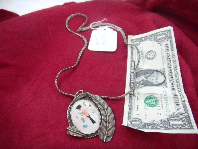 Zuni inlay mother of pearl pendant of approximately 14 inches with a cardinal jet coral and turquoise inlay surrounded by silver leaf motive, approximately 14 inches. Pendent has jet, coral. shipping $14.50. Condition is good and age is from 1960's