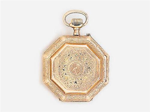14 K gold, octagonal case with engraved decoration, enamelled face with Roman numerals, cylinder watch, Switzerland, circa 1900, gross weight: 26.0 g, dented case, it does not work.