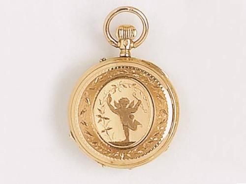 14 K gold, on the backside of the case there is Cupid, enamelled face with Roman numerals, cylinder watch in working condition, Switzerland, circa 1900, case number: 117967, gross weight 24.8 g, dented.