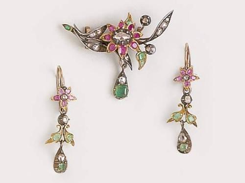 14 K gold and silver, leaf and bud form pieces, ruby, emerald and diamond decoration, the earrings are suspending form with front closing swivel, mid 19th century, weight 8.8 g.
