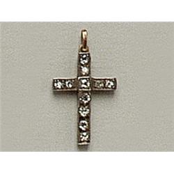 14 K gold and silver, straight Latin cross, 11 tiny brilliants circa 0.30 ct (R2CrSi), circa 1930, weight: 1.3 g, in good condition.