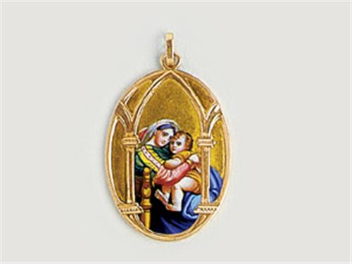 14 K gold frame, oval form, gold-plated and painted enamelled Virgin Mary with the Child, Latin prayer on the backside, gross weight: 6.8 g.