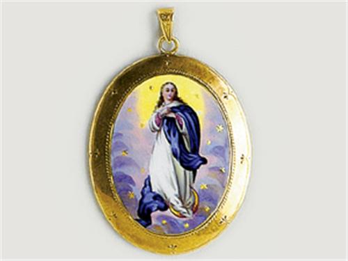 14 K gold frame, big oval painted, enamelled, applied Virgin Mary with the Child, Hungarian prayer on the backside, gross weight: 27.7 g.