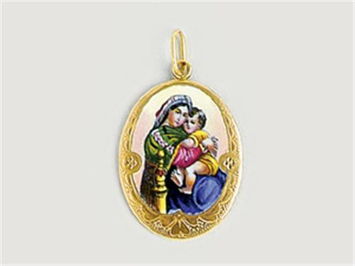 14 K gold frame, oval form, painted, enamelled Virgin Mary with the Child, Latin prayer on the backside, gross weight: 5.1 g, damaged enamel.