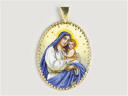 14 K gold frame, bigger oval form painted, enamelled Virgin Mary with the Child, Latin prayer on the backside, hallmarked, gross weight: 15.5 g, the frame is later replacement, damaged enamel.