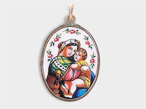 Oval form, painted enamel depicting the Blessed Virgin with the Infant, there is a Latin prayer on the reverse, gross weight: 3.7 g, restored, worn frame.