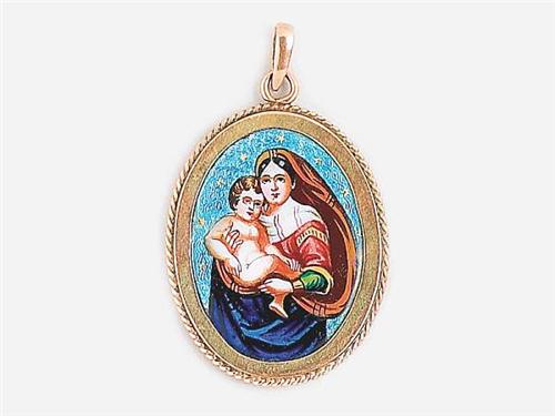 14 K gold, thick frame, oval form, painted enamelled decoration depicting the Blessed Virgin with the Infant, there is a Latin prayer on the reverse, gross weight: 10.1 g.