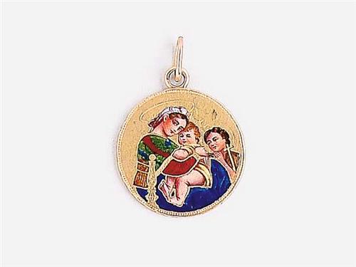 Gold, Hungarian 20 crown face with cloisonné enamel depicting the Blessed Virgin with the Infant and Saint John the Baptist, gross weight: 5.4 g, worn.