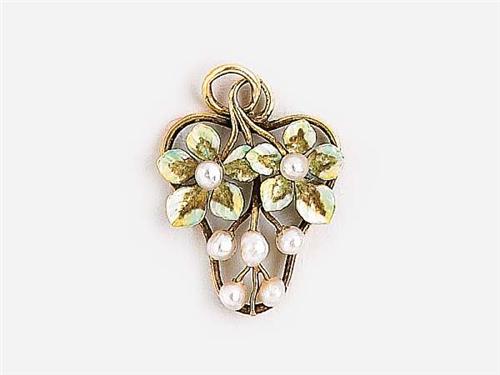 14 K gold, Art Nouveau style jewel, leaf and bud floral form, green enamel and real pearl decoration, circa 1910, import mark, weight: 4.1 g.