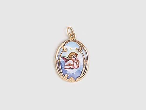 14 K gold frame, painted enamelled kneeling angel, gross weight 2.8 g, damaged frame.