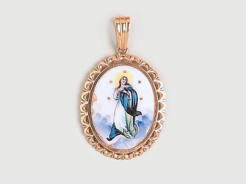 14 K gold frame, bigger oval form, painted enamelled, depicting the Blessed Virgin, with prayer on reverse, gross weight 10.8 g, imperfect enamel.