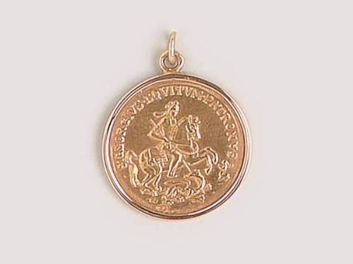 14 K gold, beaten coin depicting Saint George with the Dragon, circa 1900, marked, weight 5.6 g.