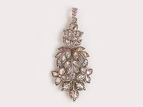 Weak gold alloy and silver, leaf and flower motif, 31 closed set diamonds circa 1.0 ct, mid 19th century, weight 5.7 g, altered.