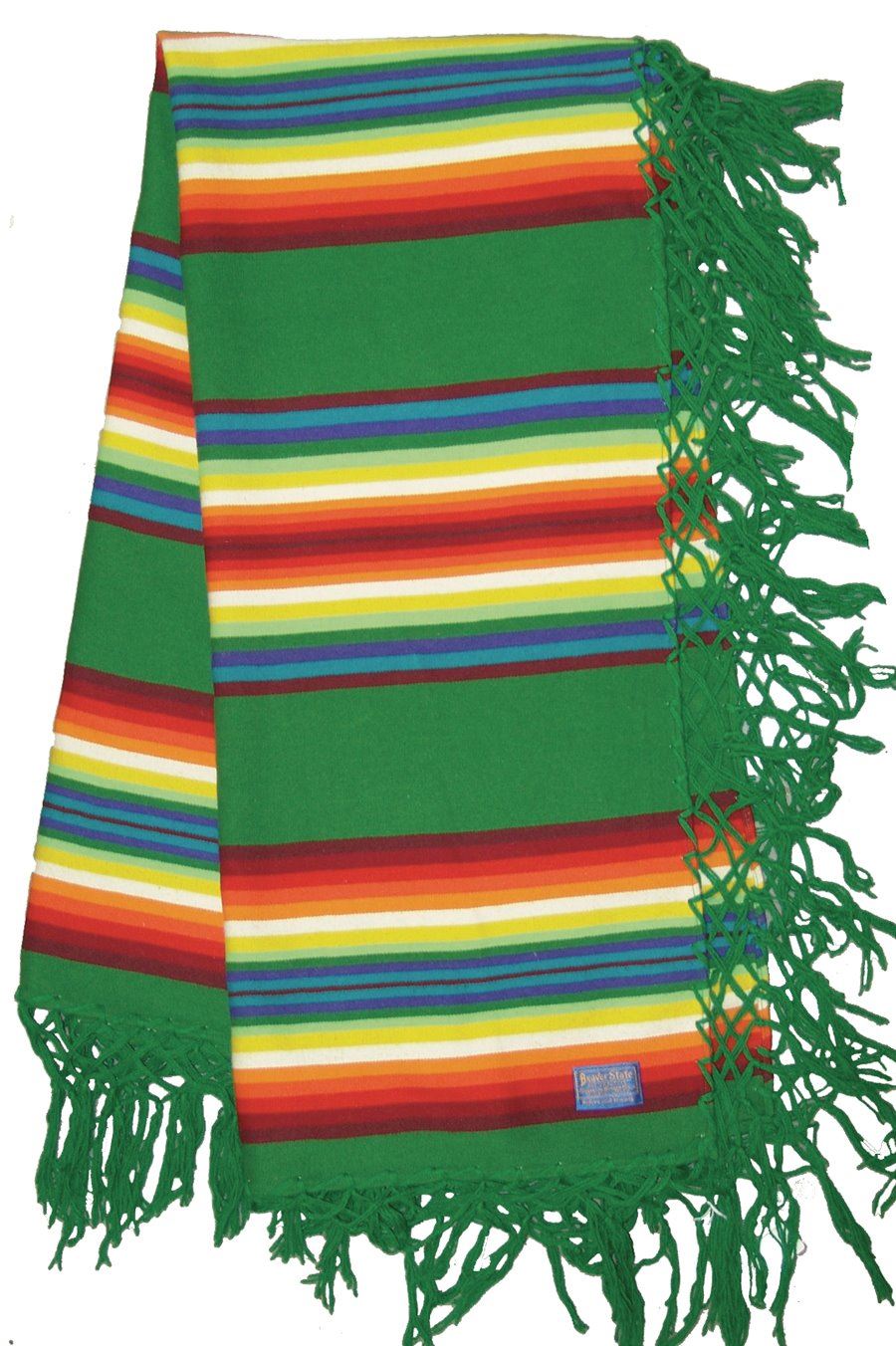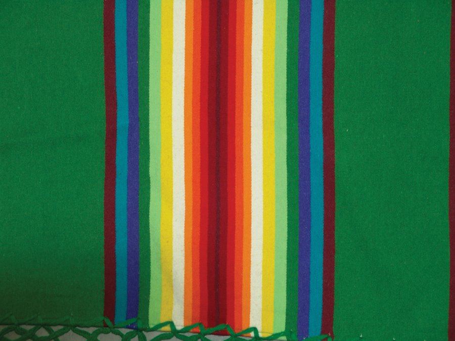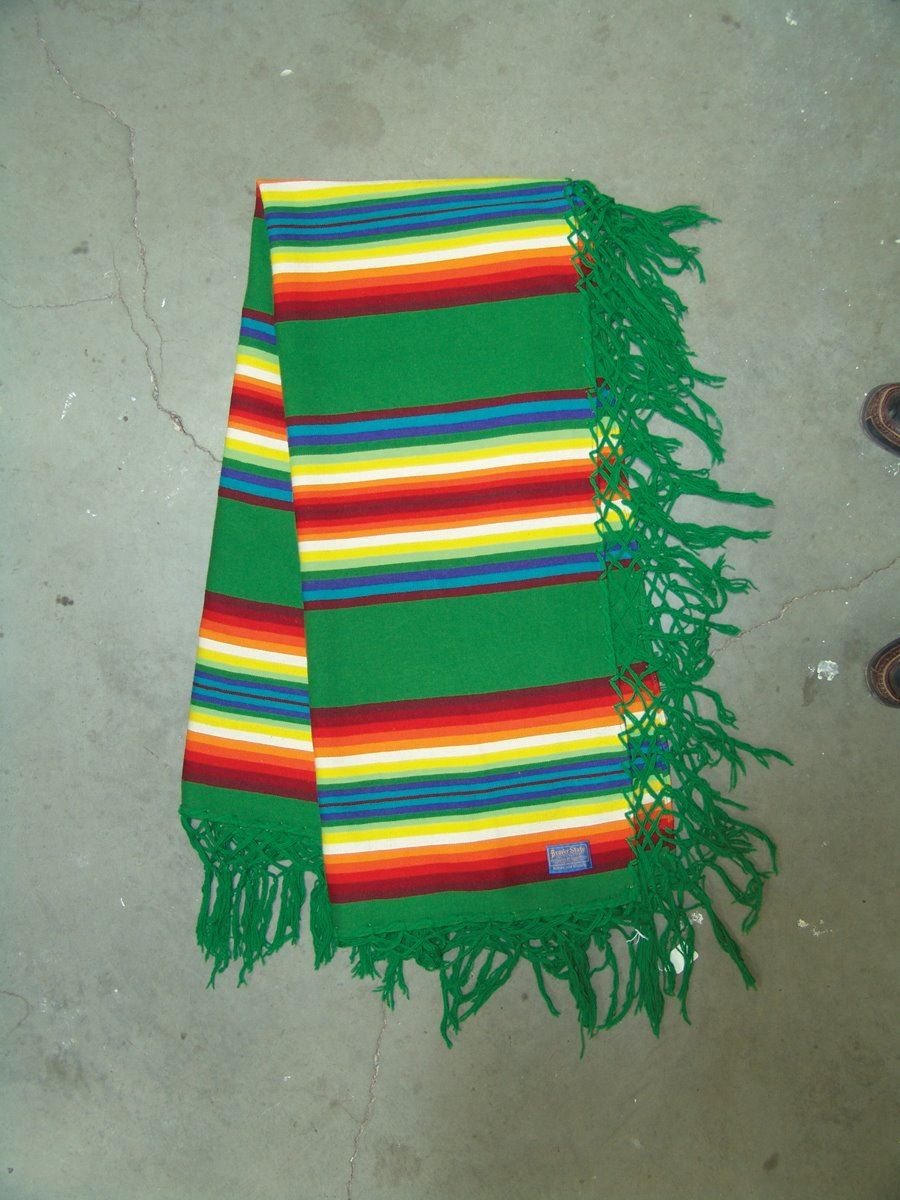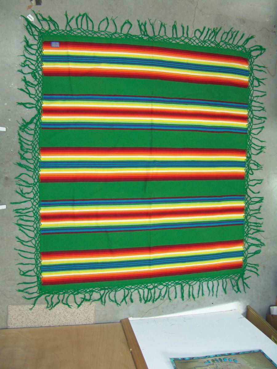 Classic green all wool "serape" with colorful banded pattern and hand knotted fringe all around. Very good, shows light use.,Ca. 1980s,60" x 60"