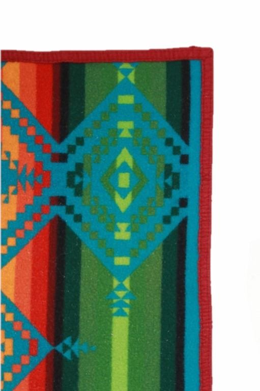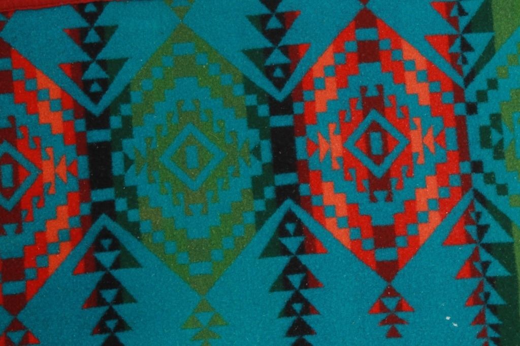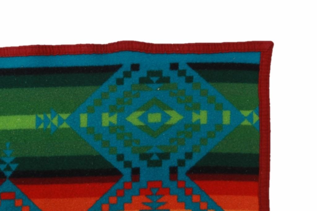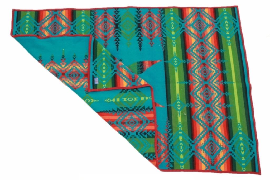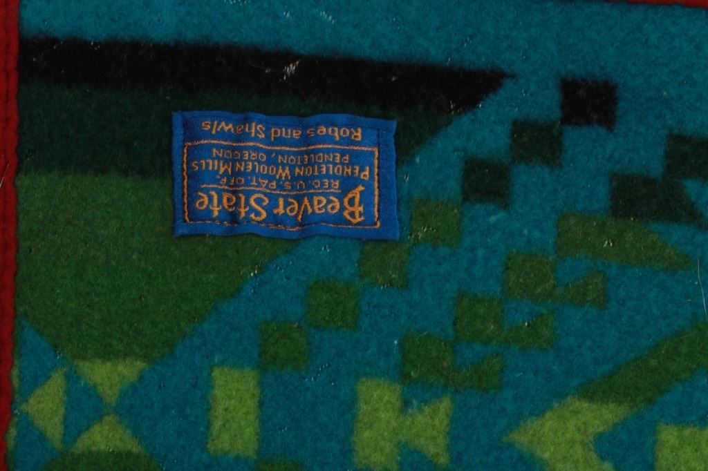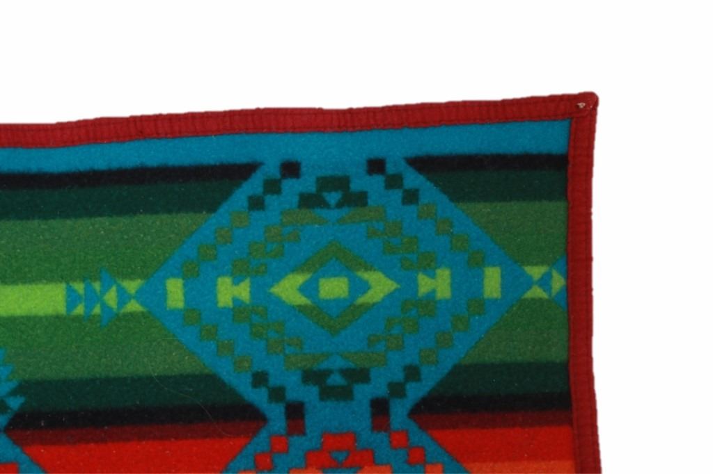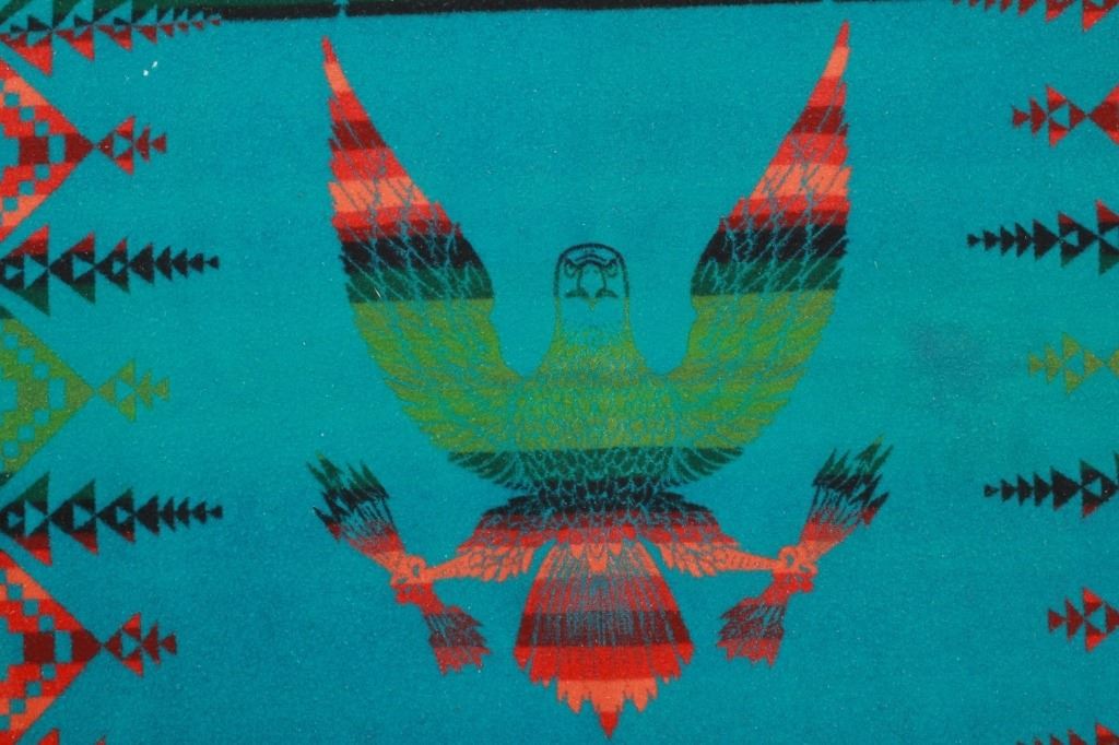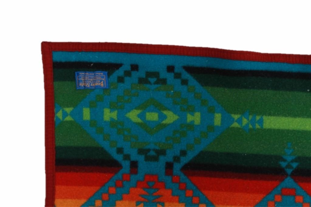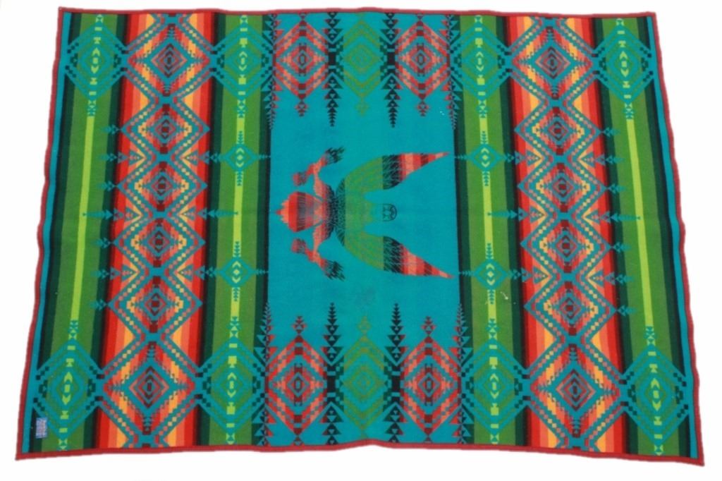 Featured in this lot is this Pendleton Chief Joseph, Beaver State wool, Native American Indian blanket, first woven in the 1920s. Chief Joseph led the Nez Perce tribe native to northeastern Oregon in the late 1800s. Widely admired for protecting his people and speaking the truth, he is honored with this design, symbolizing bravery. Bold arrowheads represent the chief's courage, strength, and integrity. Woven in Pendleton's Pacific Northwest mills and softly napped, the rug features a teal field with a multicolor war eagle centered on the rug with bands of green, red, and orange. The condition of this blanket is good, with no obvious signs of damage. The measurements of this rug are 70" x 49 1/2".