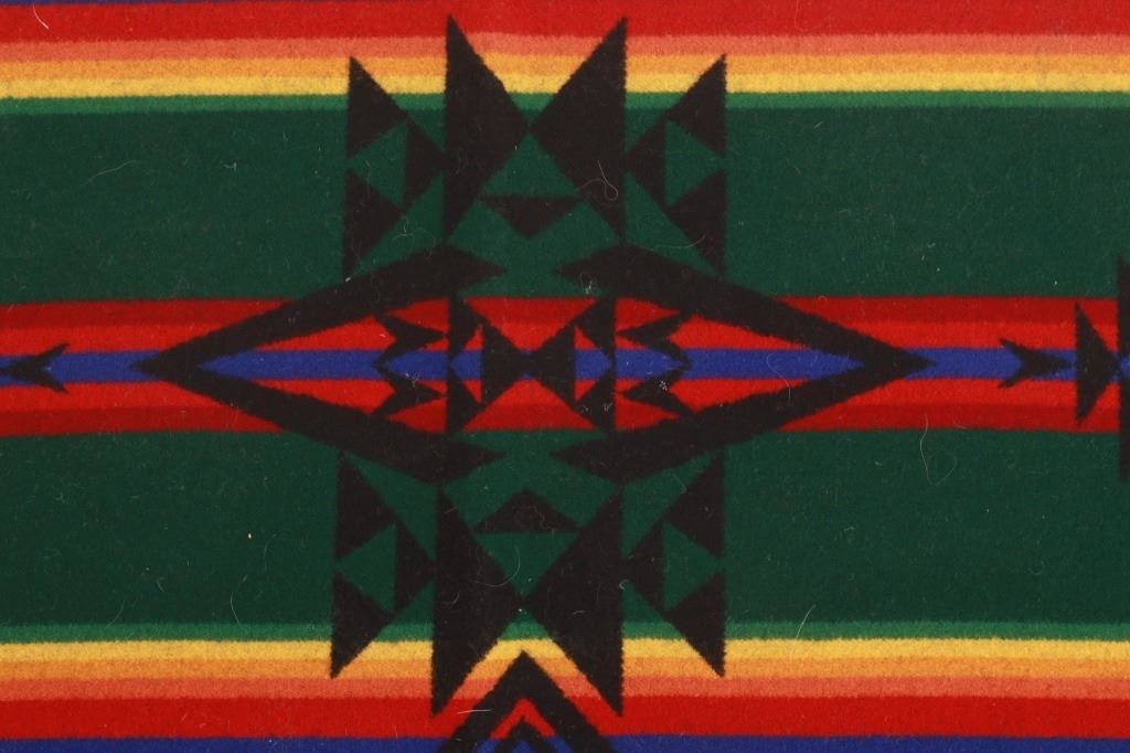 Featured in this lot is this Pendleton Chief Joseph, Beaver State wool, Native American Indian blanket, first woven in the 1920s. Chief Joseph led the Nez Perce tribe native to northeastern Oregon in the late 1800s. Widely admired for protecting his people and speaking the truth, he is honored with this design, symbolizing bravery. Bold arrowheads represent the chief's courage, strength, and integrity. Woven in Pendleton's Pacific Northwest mills and softly napped. The rug features a classic Chief Joseph pattern that shows a green field and bands of blue, red, orange, light orange, and yellow; the rug shows geometric patterns in black throughout the rug. The condition of this rug is good and in pristine condition with no obvious signs of damage. The measurements of this rug are 65" x 39".