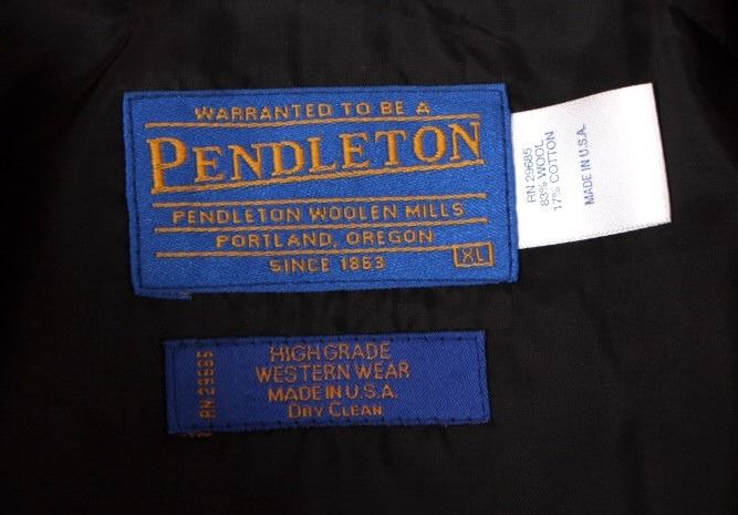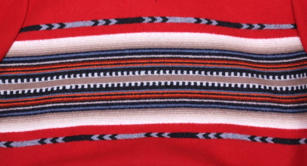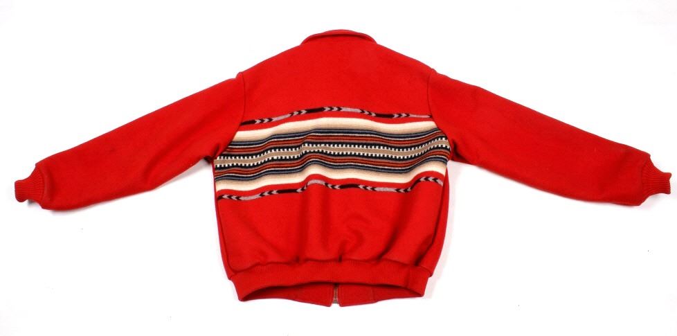 Available for your bidding pleasure we have a Pendleton Wool Blend Western Wear Jacket. The jacket shows a Southwestern Native American Indian inspired pattern. This jacket boasts bright red, orange, navy blue, sky blue and many more warm colors. The jacket shows a synthetic nylon interior, two waist pockets, an inside breast pocket, a zipper closure, and and waist and wrist elastic bands. The coat shows the 1994-2009 Pendleton tag, reading; "Warranted to be a Pendleton - Pendleton Woolen Mills - Portland, Oregon - Since 1863 - XL - RN 29685 - High Grade Western Wear - Made In U.S.A. - Dry Clean - 83% Wool - 17% Cotton". The coat shows very good condition. The coat is a size Extra Large, and measures 24" across the chest, underneath both armpits, 26 1/4" from the shoulder seam to the wrist, and 28" from the neck line, to the waist.