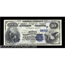 <TABLE cellSpacing=0 cellPadding=0 width="100%" bgColor=#000000 border=0><TBODY> <TR><TD width="100%"><TABLE cellSpacing=1 cellPadding=3 width="100%" border=0><TBODY><TR><TD width="100%" bgColor=#79735c><FONT face=arial color=#ffffff size=3><B>Description</B> </FONT></TD></TR><TR><TD width="100%" bgColor=#ffffff><FONT face=arial size=2><B>Pendleton, OR</B></I> - $10 1882 Date Back Fr. 545 <B>The First NB</B></I> Ch. # (P)2630<BR>A lovely example which is the nicest early Pendleton note we've ever seen or heard of. Well centered <B>Extremely Fine,</B></I> with great color, centering, and just plain eye appeal.<BR><I>From Roy Sparks, Jr. in February of 1996.</B></I> (3,000-6,000 ) </FONT></TD></TR></TBODY></TABLE></TD></TR></TBODY></TABLE><BR><TABLE cellSpacing=0 cellPadding=0 width="100%" bgColor=#000000 border=0><TBODY><TR> Important notice: Heritage usually auctions material at the rate of 200-250 lots per hour. On some occasions eBay Live bid software or the Internet may not be able to keep up with the pace of the auction. We recommend placing a realistic absentee bid now as insurance to avoid disappointment. Occasionally the auctioneer may eliminate or reject an eBay Live bid, and the auctioneer may also reopen a lot after the close of the eBay live bidding (usually because we missed an audience bid), and may reject your bid even if it shows you as the winning bidder. By bidding via eBay Live, you agree that Heritage may award the lot to another bidder at its sole discretion under the circumstances described above or any other reasonable circumstances. Also please note that all Heritage lots purchased through eBay Live carry a 20% Buyer's Premium. Please make sure you read the Terms and Conditions before you bid.</TR></TBODY></TABLE>